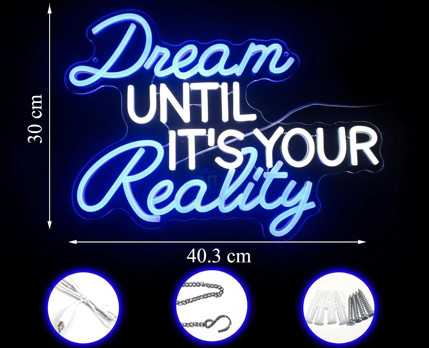 L’enseigne néon LED "DREAM UNTIL IT'S YOUR REALITY" est bien plus qu’un simple objet de décoration — c’est une source d’inspiration quotidienne. Parfaite pour chambres, salles de sport, bureaux, home office, fêtes ou tout espace nécessitant une touche motivante, cette lampe combine design moderne et message puissant.